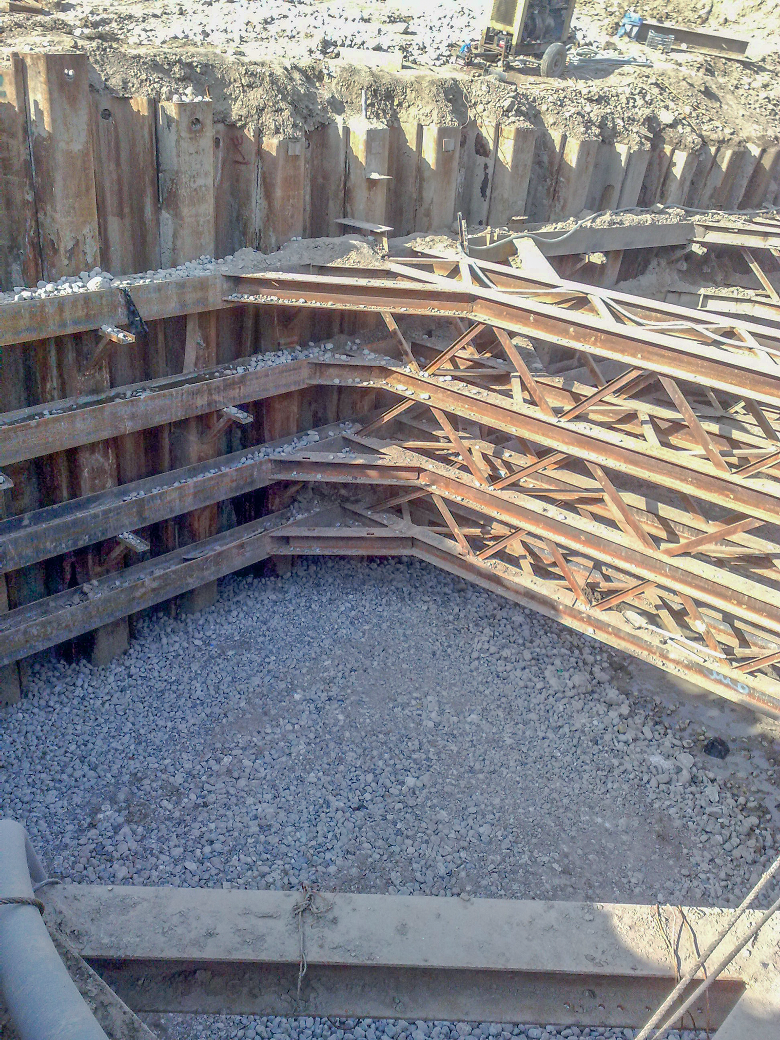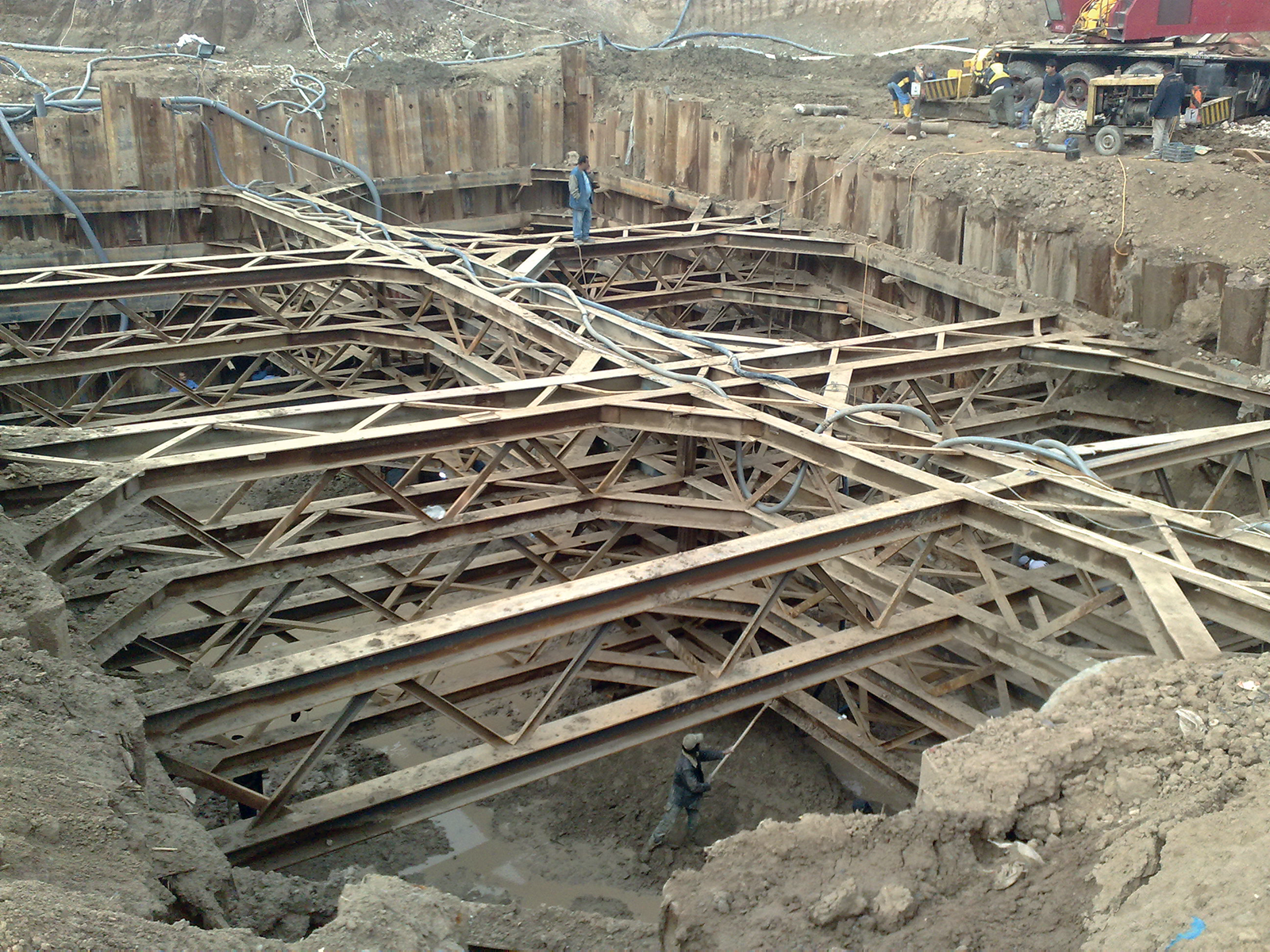 - تدعيم الركائز الحديدية بواسطة قطع حديد ( beam) و اضافة الجلمود و حدله و صب طبقة التعمية (blinding).
